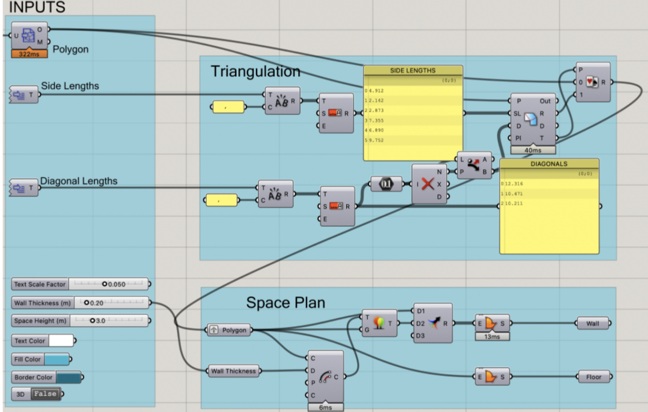Both components take the same inputs: a closed polygon (polyline), an ordered list of side lengths and the requested diagonals. You can input a polygon with any number of sides, convex or concave, with whatever rotation or scaling. The only rule is that the polygon must be morphologically similar to the shape you want to survey. Two polygons are morphologically similar when they have the same number of sides and the same sequence of corner types.