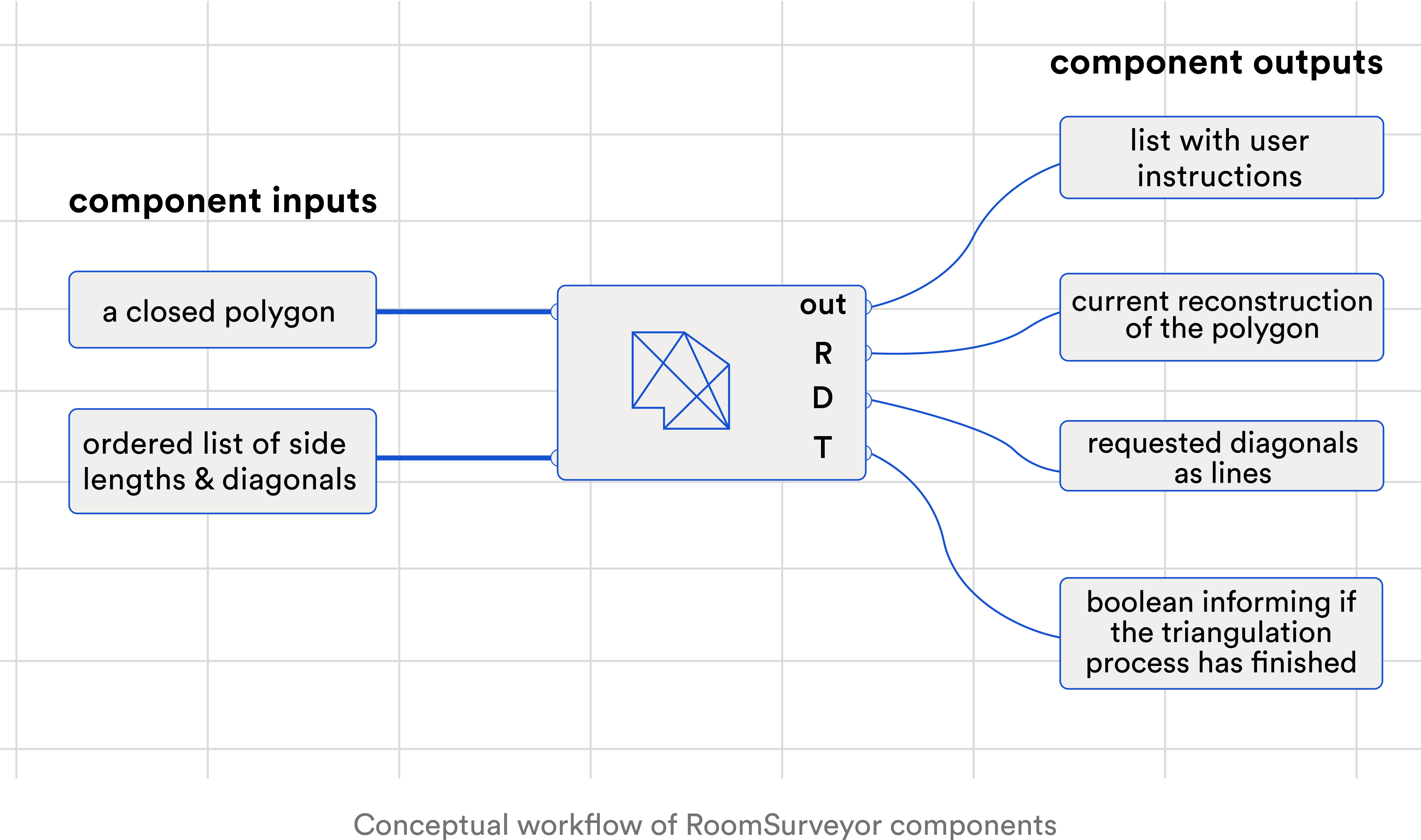 The component outputs are a list with the user instructions [out] , the current reconstruction of the polygon (more on this latter) [R] , the requested diagonals as lines [D] , and a boolean that informs if the triangulation process has finished [T] .